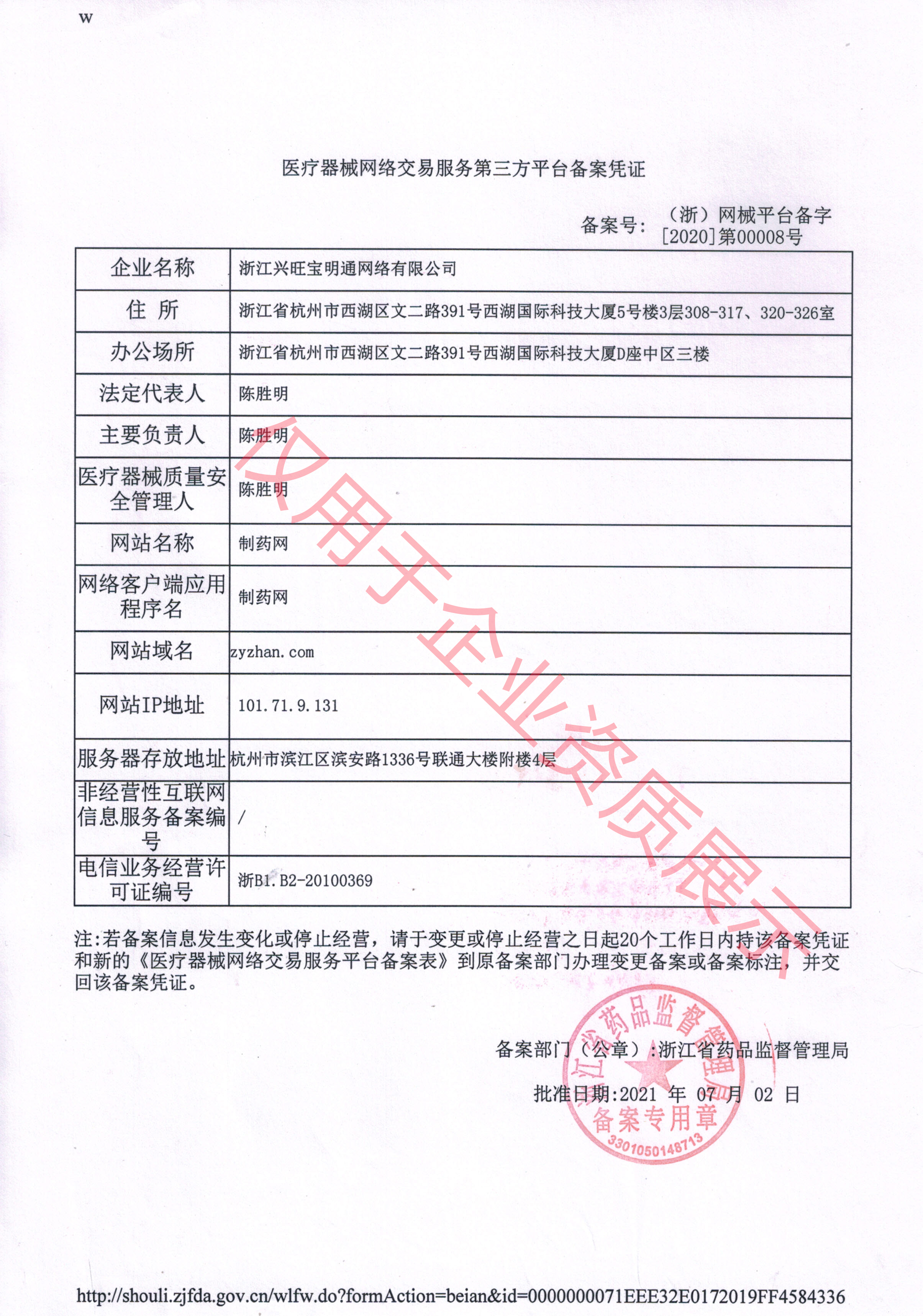 醫(yī)療器械網(wǎng)絡(luò)交易服務(wù)第三方平臺備案憑證